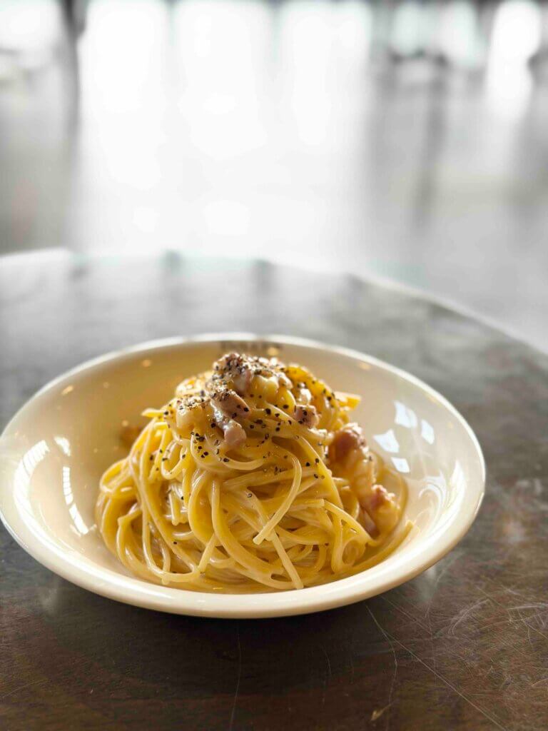 厚切りのベーコンから出る旨味のある塩気と、ピリッと刺激的なブラックペッパー。これが濃厚なクリームソースをキリッと引き締め、最後まで飽きさせない味の構成になっています。